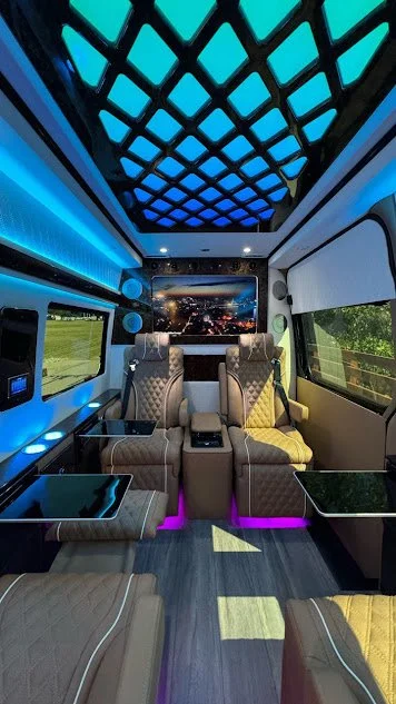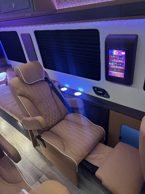 Time Time Travels has four captain’s chairs with massage functionality, complimentary beverage bar, sound system, Wi-Fi, & Television.